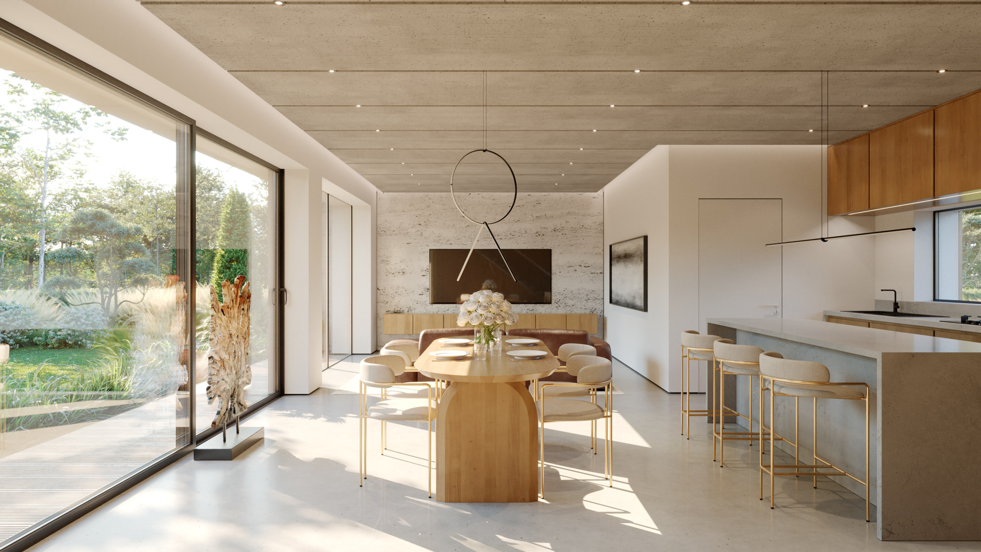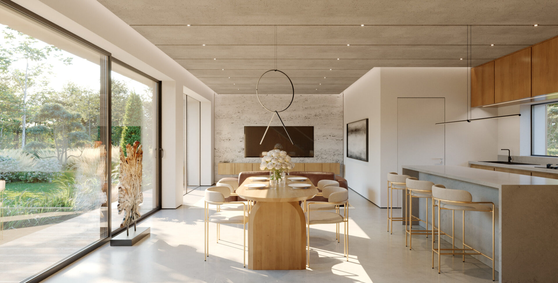 Przestronny salon połączony z aneksem kuchennym z wyspą a dzięki dużym przeszkleniom otwarty na taras i ogród