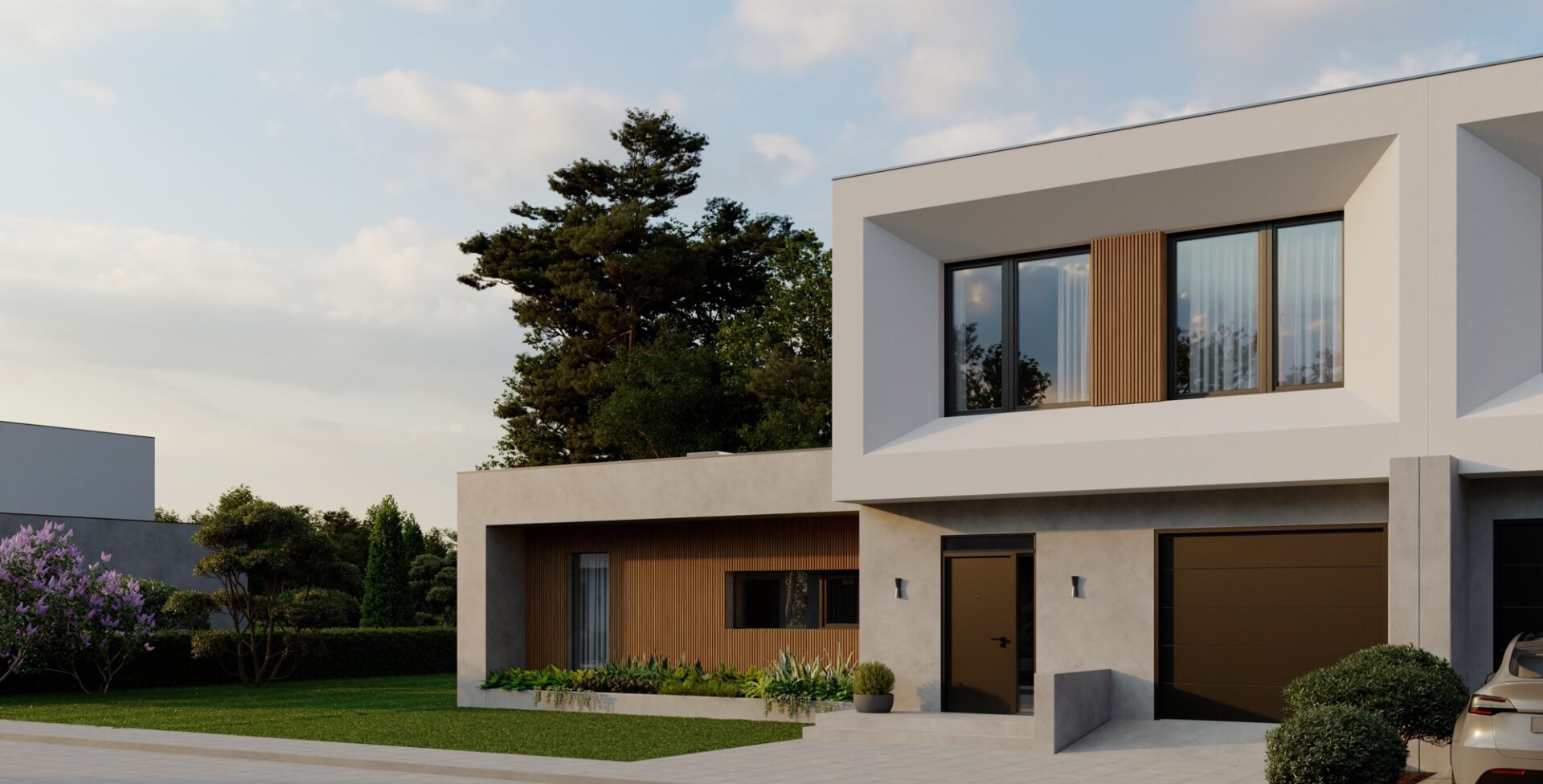 Wysokiej jakości materiały jak aluminiowe okna HST, drewniane lamele elewacyjne czy elementy wykończeniowe z betonu architektonicznego